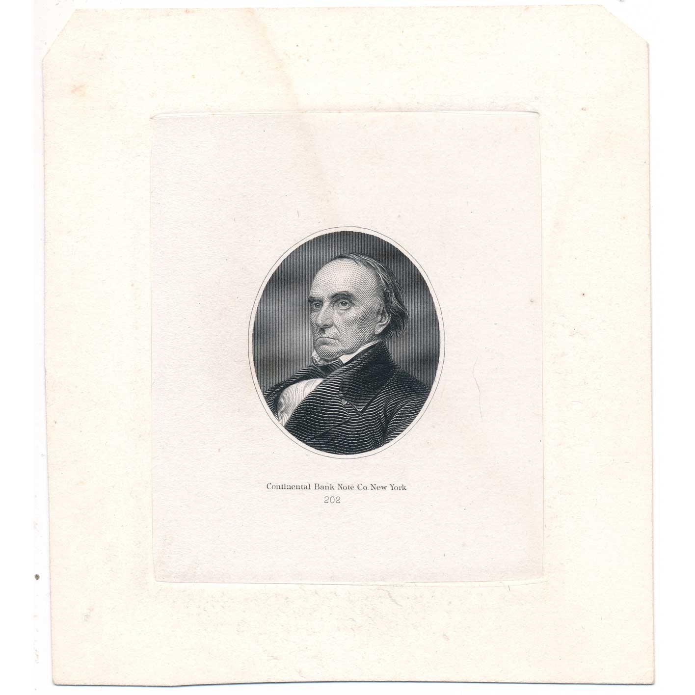 Daniel Webster Die Proof Engraving on india on card, Continental Bank Note Co.