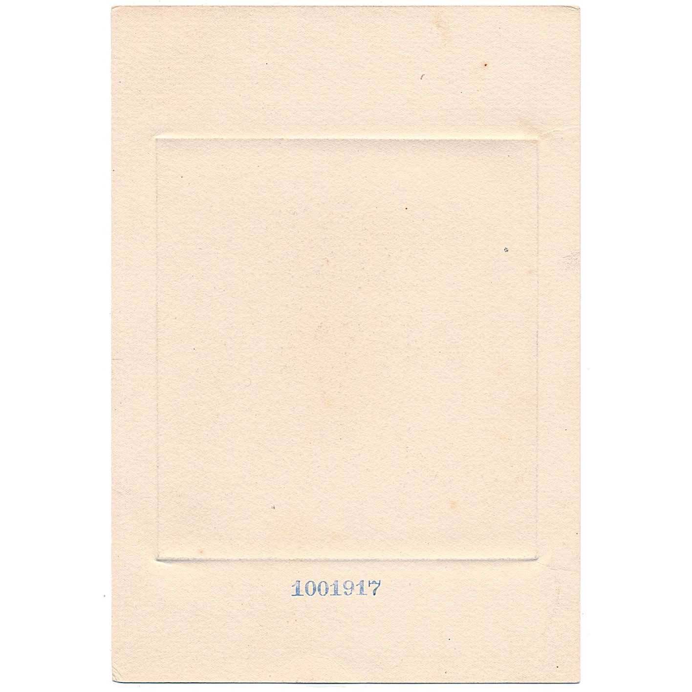 This progress proof vignette measures approximately 2″ x 2.75″ on India paper mounted on card. Overall size of the card is 5.5″ x 8″.