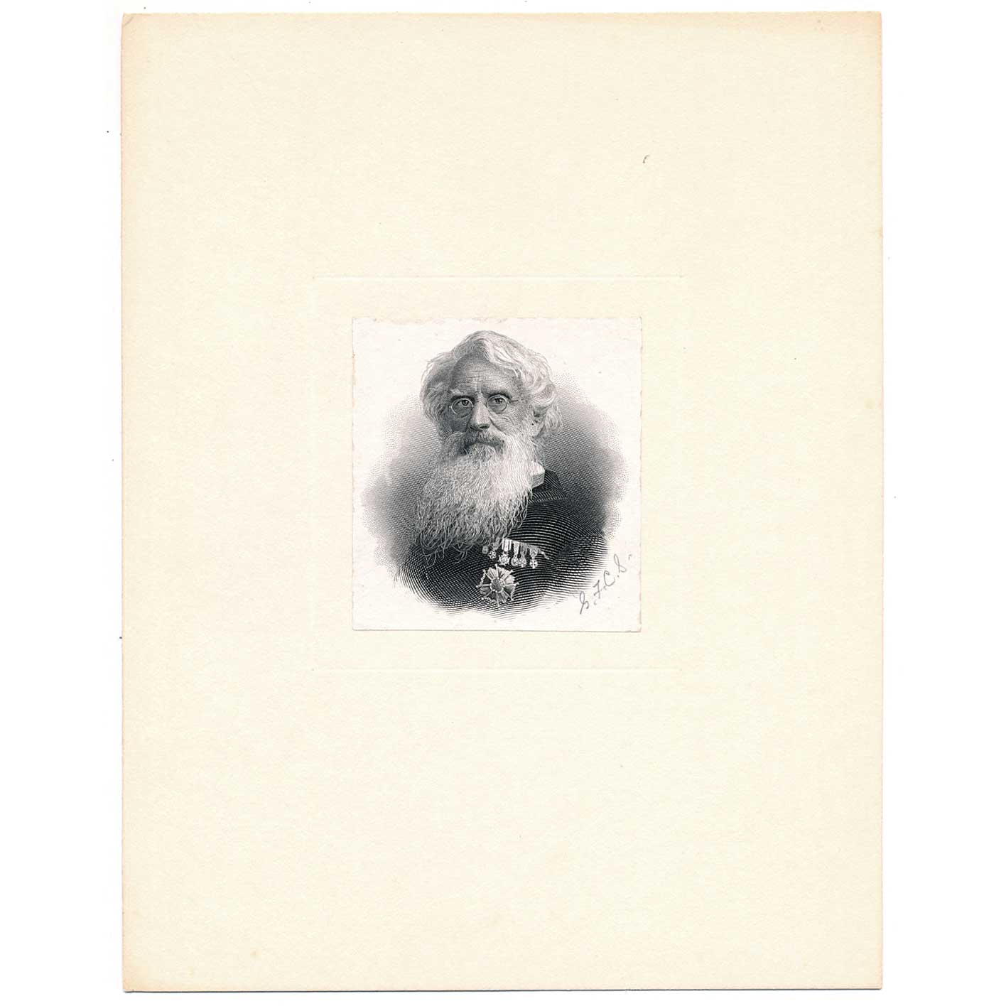 This is an engraved portrait of Samuel F. B. Morse (1791-1872), the American inventor best known for his contributions to the single-wire telegraph system and Morse code. The engraving was created by George Frederick Cumming Smillie, a prominent engraver who worked for the U.S. Bureau of Engraving and Printing (BEP). The image depicts Morse as an older gentleman with long, wavy white hair, glasses, and a very long, full white beard. He is wearing a dark coat and several medals pinned to his chest. Smillie was known for his work on U.S. banknotes and stamps, and this portrait appeared on the reverse of 1896 $2 “Educational Series” Silver Certificate note alongside inventor Robert Fulton.