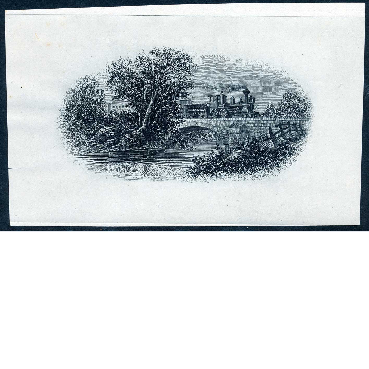“The Crossing” Locomotive Die Proof on india, by James Smillie, National Bank Note Co. 1861